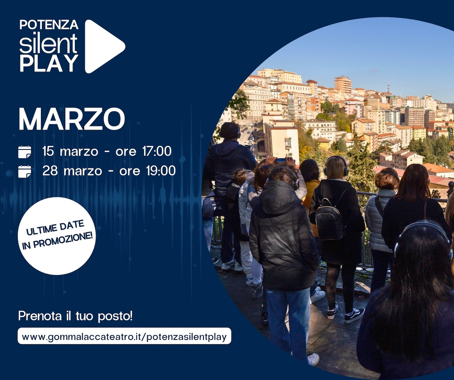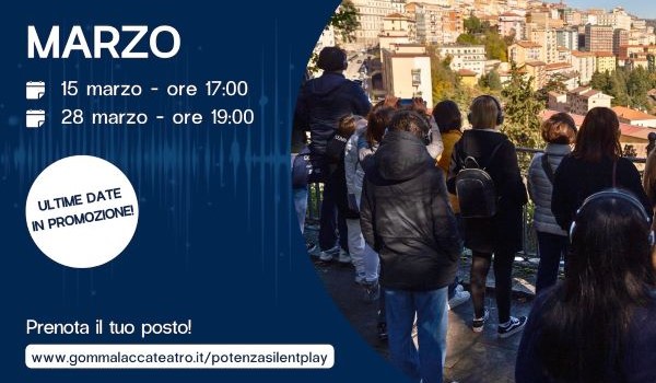 Gommalacca Teatro ti invita ad una passeggiata immersiva e ad alto tasso di interattività nel cuore di Potenza. Per ascoltare e osservare con una percezione nuova i luoghi, le relazioni, la comunità, il patrimonio materiale e immateriale della città. Per cambiare il nostro rapporto con la realtà che ci circonda.