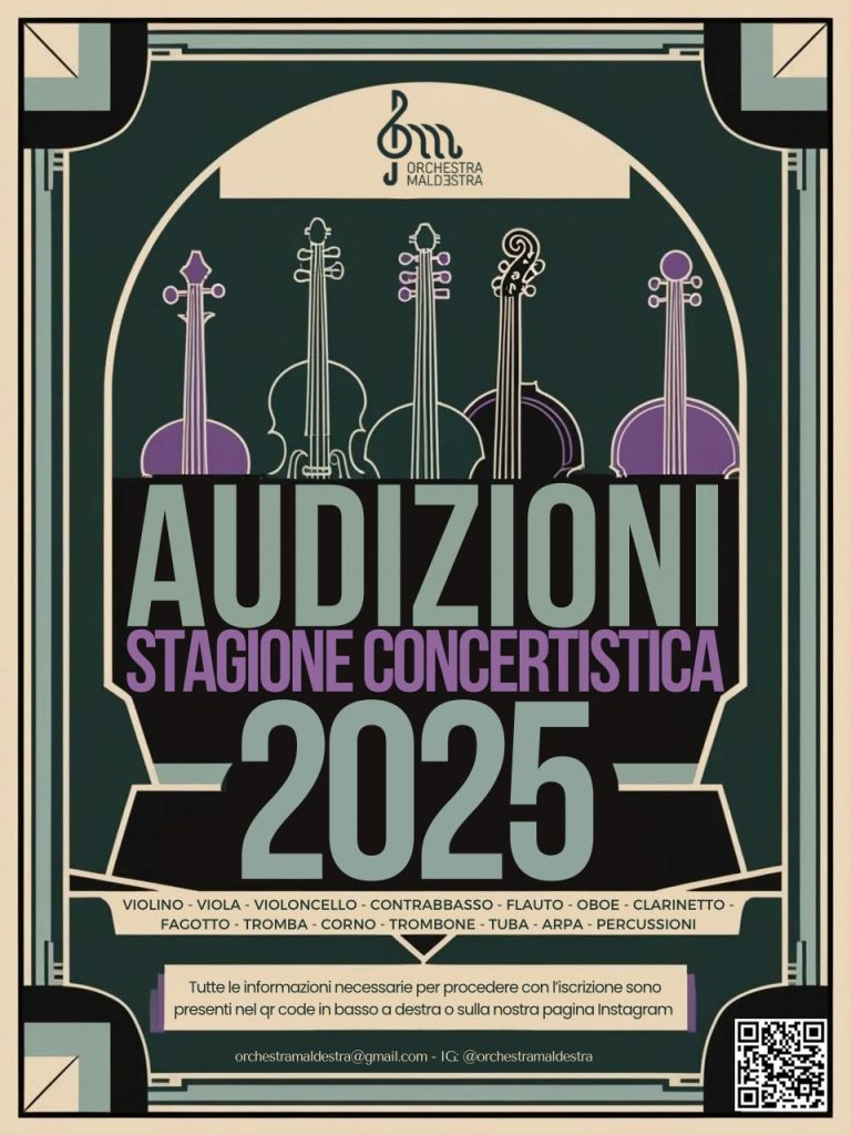 I candidati dovranno presentarsi un’ora prima dell’orario delle audizioni e portare il proprio strumento. I percussionisti e gli arpisti possono inviare un video. Per ulteriori informazioni, contattare l’associazione via email a orchestramaldestra24@gmail.com o telefonicamente ai numeri 344 131 0798 (presidente) e 331 321 1958 (referente audizioni).