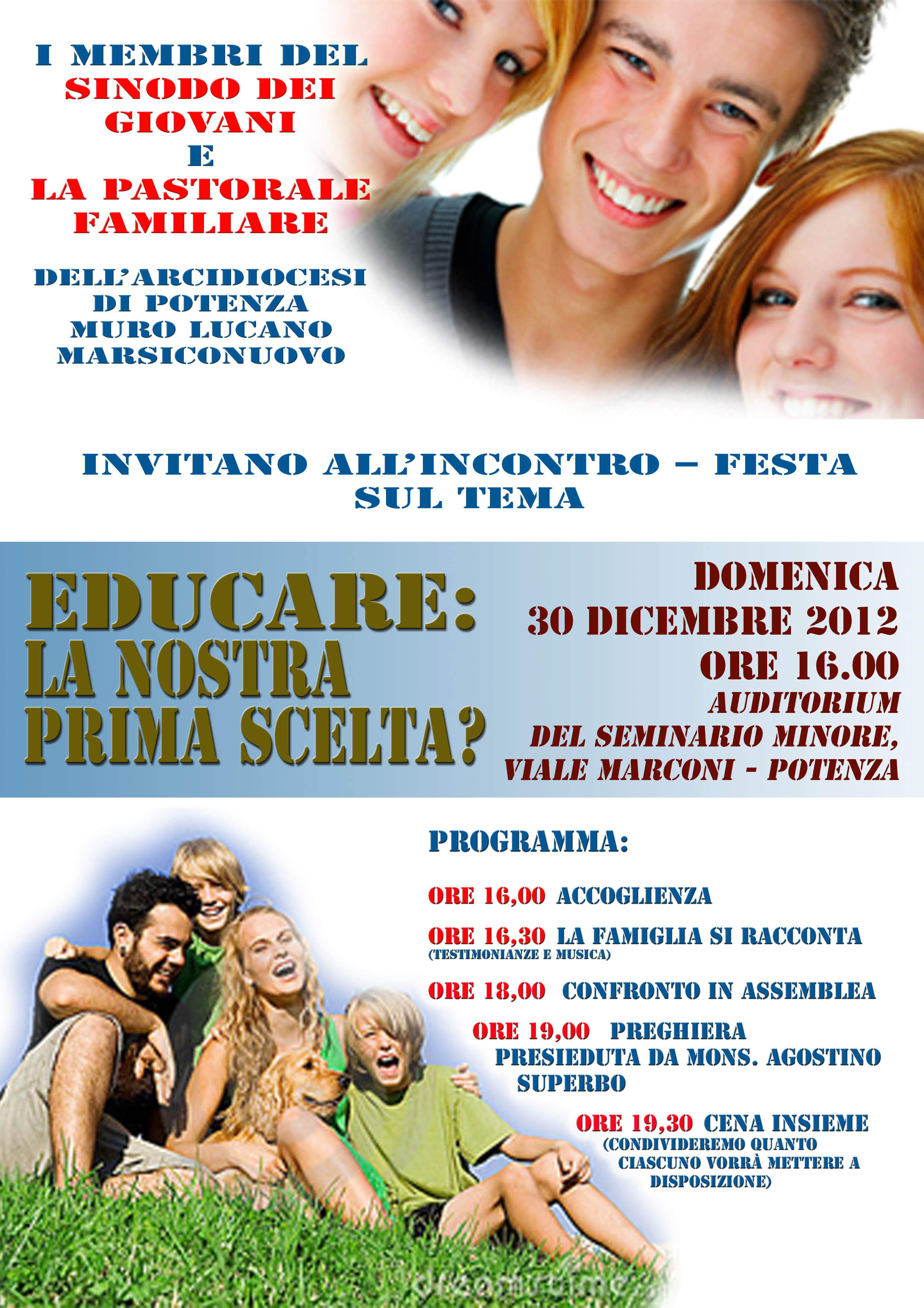30 Dicembre 2012 Pastorale familiare Educare: la nostra prima scelta? Domenica 30 dicembre, ore 16.00 Auditorium Seminario Minore, Viale Marconi – Potenza Volantino definitivo con orario.jpg