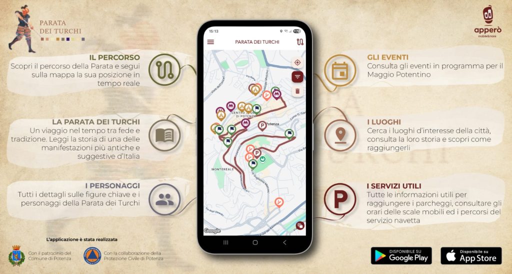 Per accompagnare cittadini e visitatori in questo viaggio nella memoria collettiva, nasce “Parata dei Turchi”, l’app ufficiale dedicata alla Parata, patrocinata dal Comune di Potenza. Uno strumento pensato per offrire un’esperienza immersiva, informata e partecipata, attraverso le narrazioni storiche, le guide alla scoperta dei luoghi di interesse della città e gli aggiornamenti in tempo reale sulla parata.