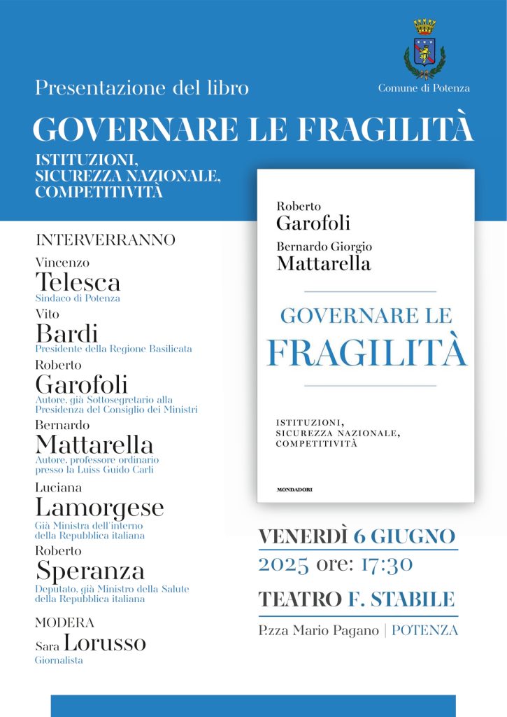 4.06.2025 – ore 11,15: “Come Amministrazione comunale di Potenza – scrivono in una nota il sindaco Vincenzo Telesca e l’assessore alla Cultura Roberto Falotico – invitiamo la cittadinanza alla presentazione del volume ‘Governare le fragilità. Istituzioni, sicurezza nazionale, competitività’ di Roberto Garofoli e Bernardo Giorgio Mattarella, che si terrà venerdì 6 giugno 2025, alle ore 17,30, nel teatro Stabile di Potenza.