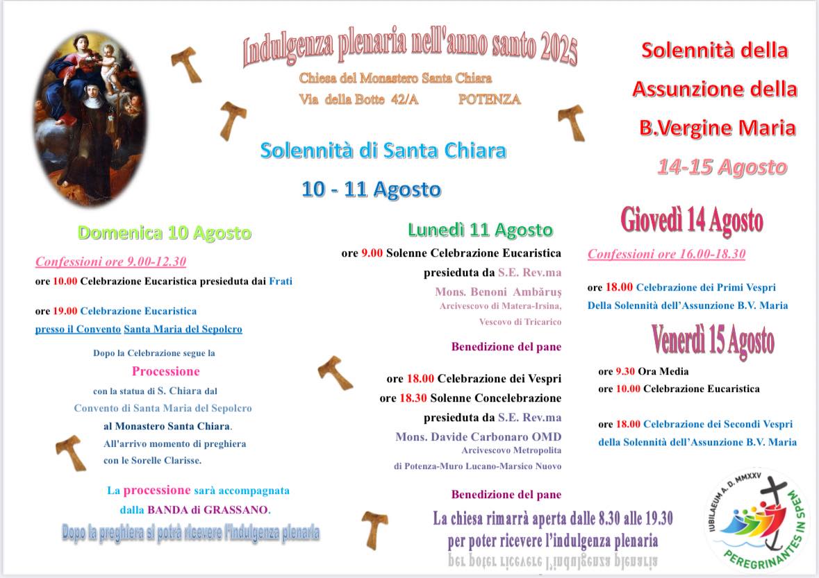 8 Agosto 2025 Celebrazioni per Santa Chiara 10 e 11 agosto 2025Parrocchia Santa Maria del Sepolcro – Monastero di Santa Chiara – Potenza Programma Santa ChiaraDownload
