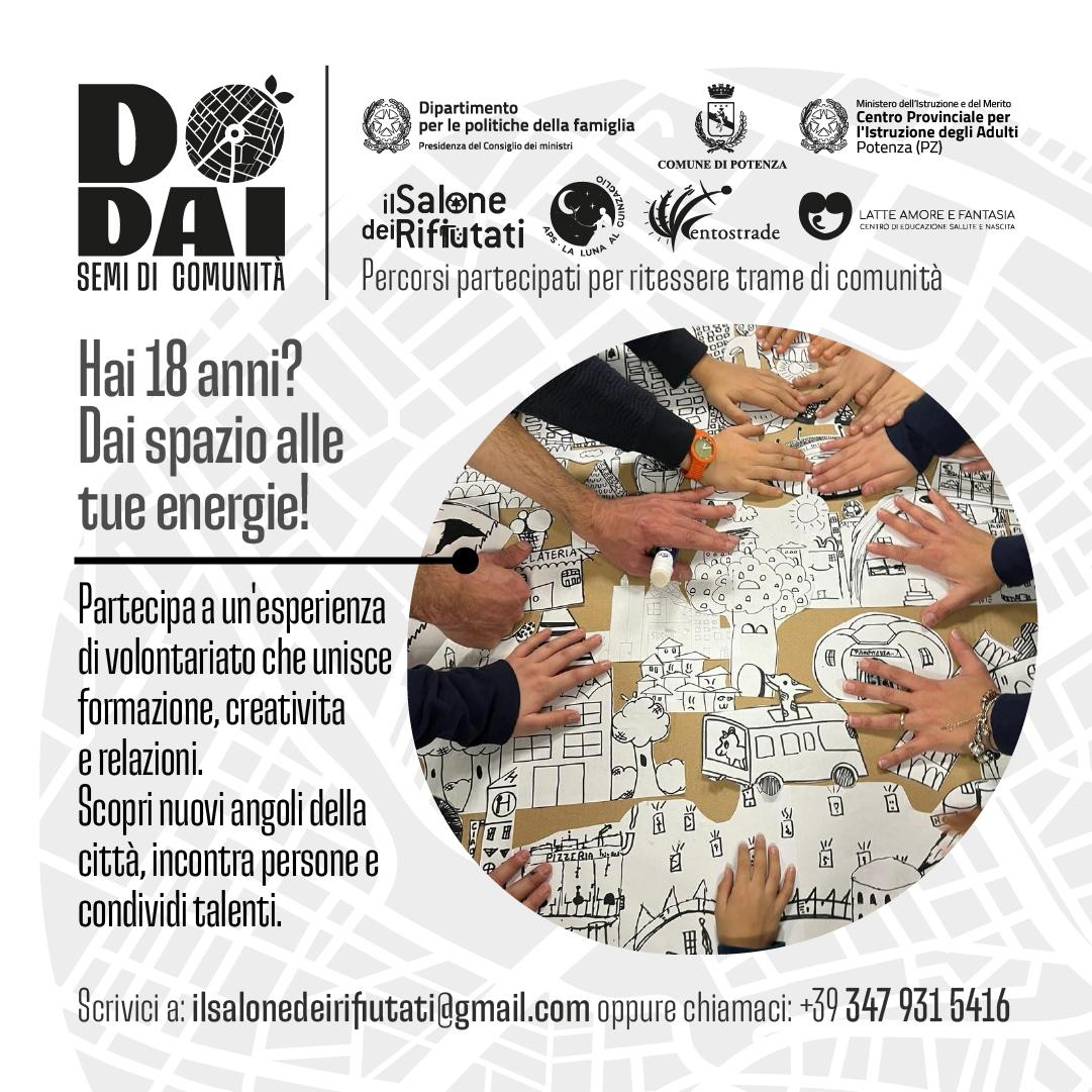 Il progetto DoDai semi di comunità finanziato dal ‘Fondo Politiche della famiglia’, nasce dal percorso di coprogettazione realizzato tra il Comune di Potenza e la Cooperativa “Il Salone dei rifiutati” – capofila di un partenariato che vede partecipi l’Associazione “La Luna al guinzaglio”, la Cooperativa “Centostrade” e l’Associazione “Latte Amore e fantasia ETS” – puntando all’inclusione e alla cura diffusa.