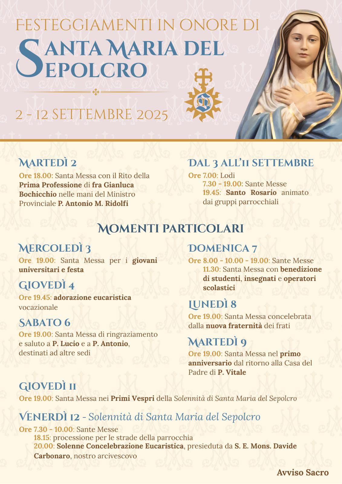 1 Settembre 2025 Santa Maria del Sepolcro Dal 2 al 12 settembre 2025 Programma festeggiamenti Santa Maria del SepolcroDownload