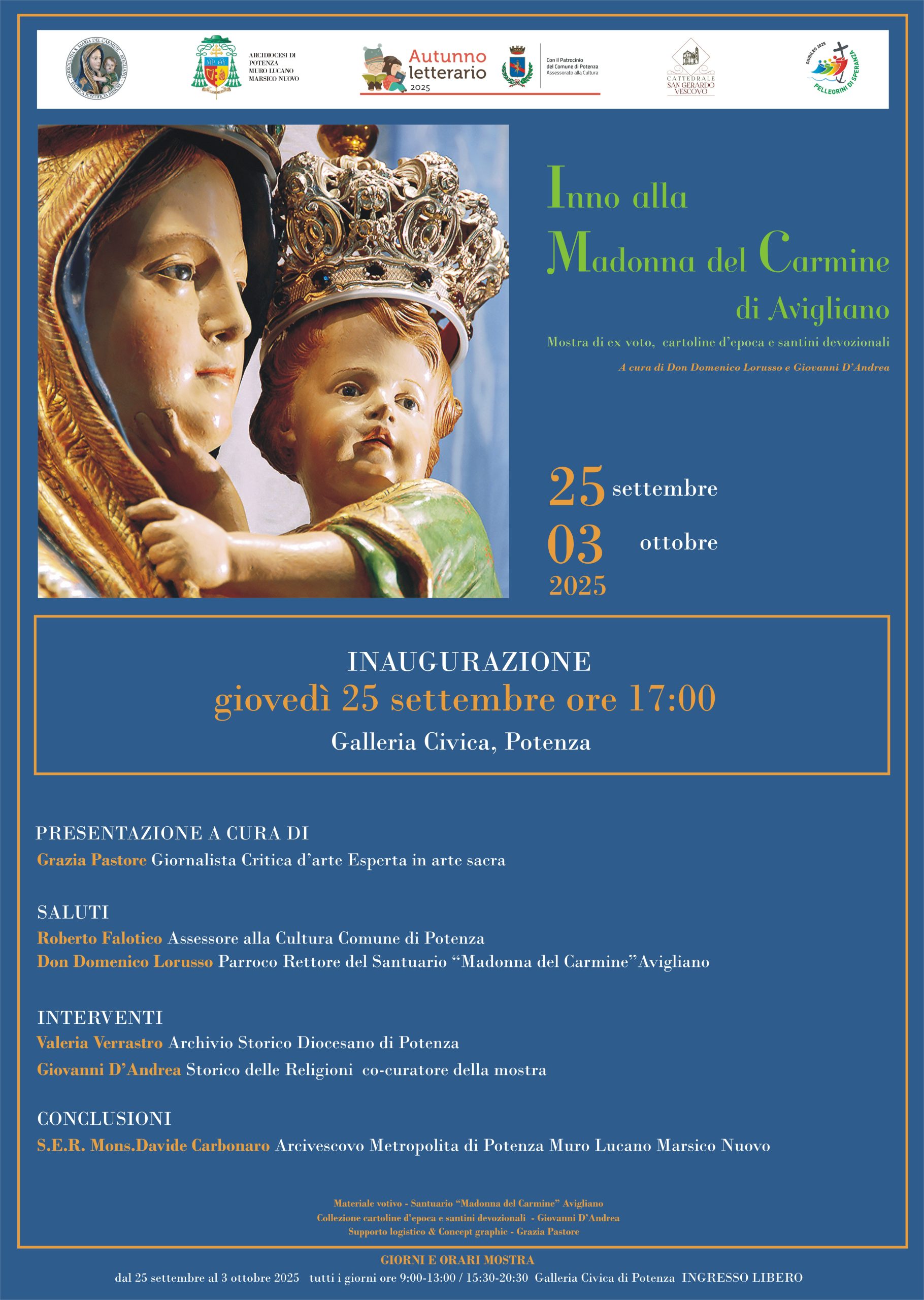 23.09.2025 – ore 8,25: ‘Inno alla Madonna del Carmine di Avigliano’ è la mostra di ex voto, cartoline d’epoca e santini devozionali che sarà inaugurata giovedì 25 settembre alle ore 17 nella Galleria Civica di Potenza.