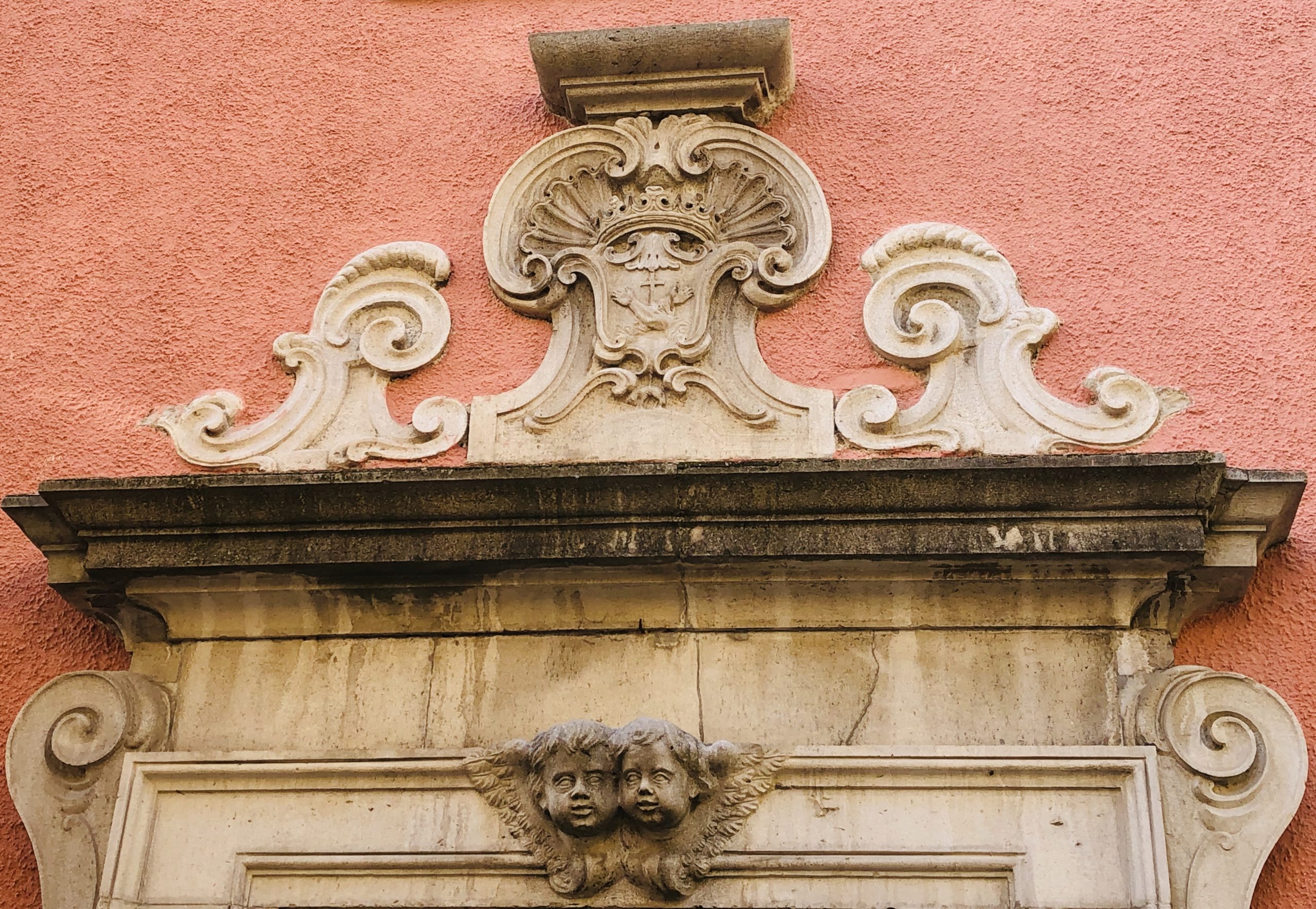 Il portale è mpreziosito da vari elementi decorativi, tra cui spiccano due teste alate di due cherubini che sormontano lo stipite dell’ingresso. Sopra di esse si trova uno stemma francescano, ordine di cui faceva parte il frate.