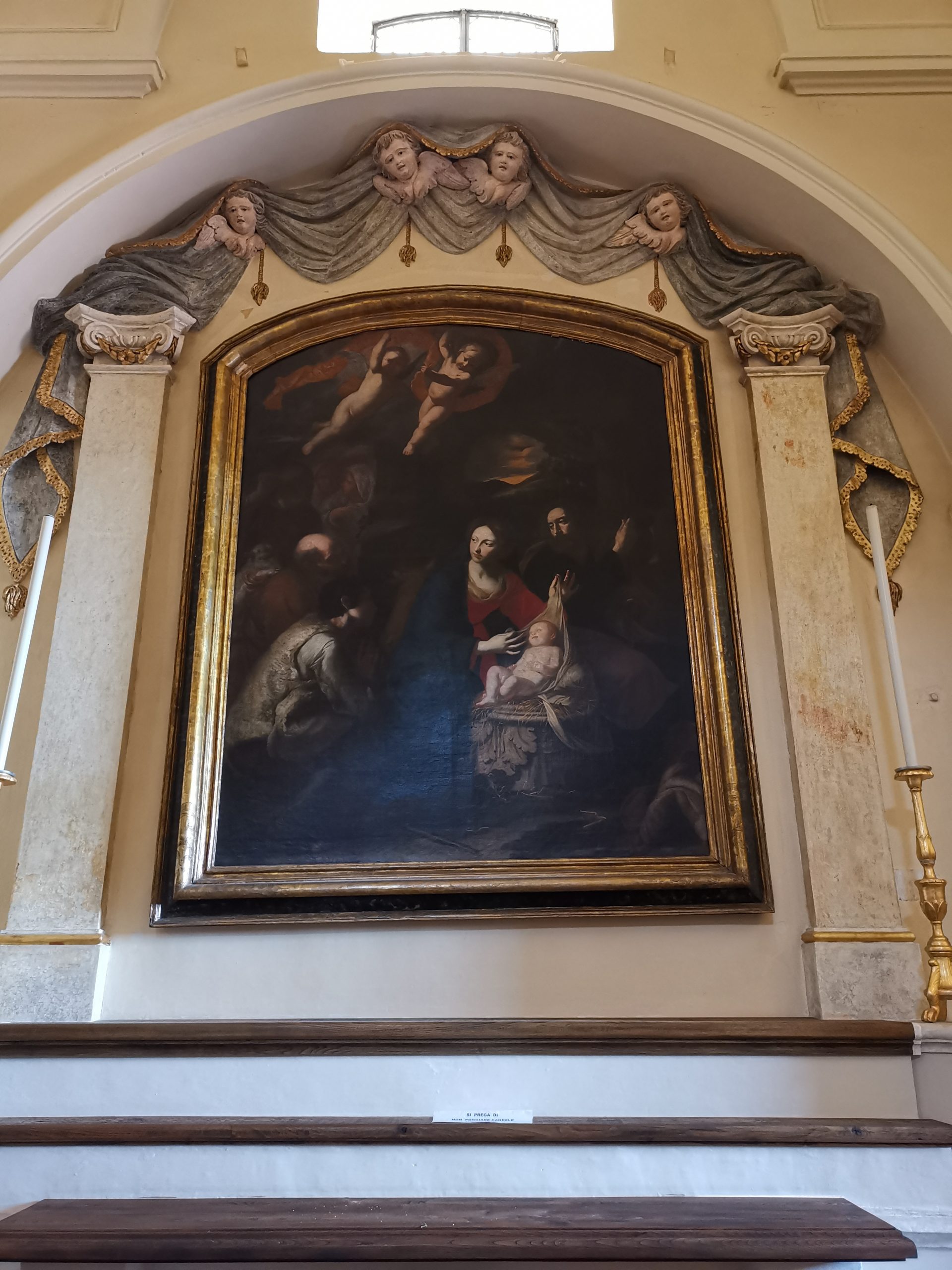 L’Adorazione del Pastori, risalente al XVII secolo, è un’opera di Giovanni Ricca, tela di gran pregio artistico la cui vera protagonista è la luce che fa emergere dalla penombra le immagini della Sacra Famiglia e dei due angioletti.