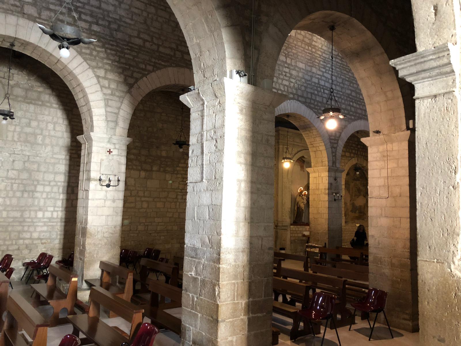 Le linee interne dell’edificio sono romaniche. La pianta basilicale conta tre navate absidate e divise tra loro da dodici pilastri quadrati, senza basi di fondo, con capitelli a piramide tronca rovesciata. Le navate hanno il soffitto coperto da capriate in legno e sono illuminate da piccole finestre a doppio strombo.
