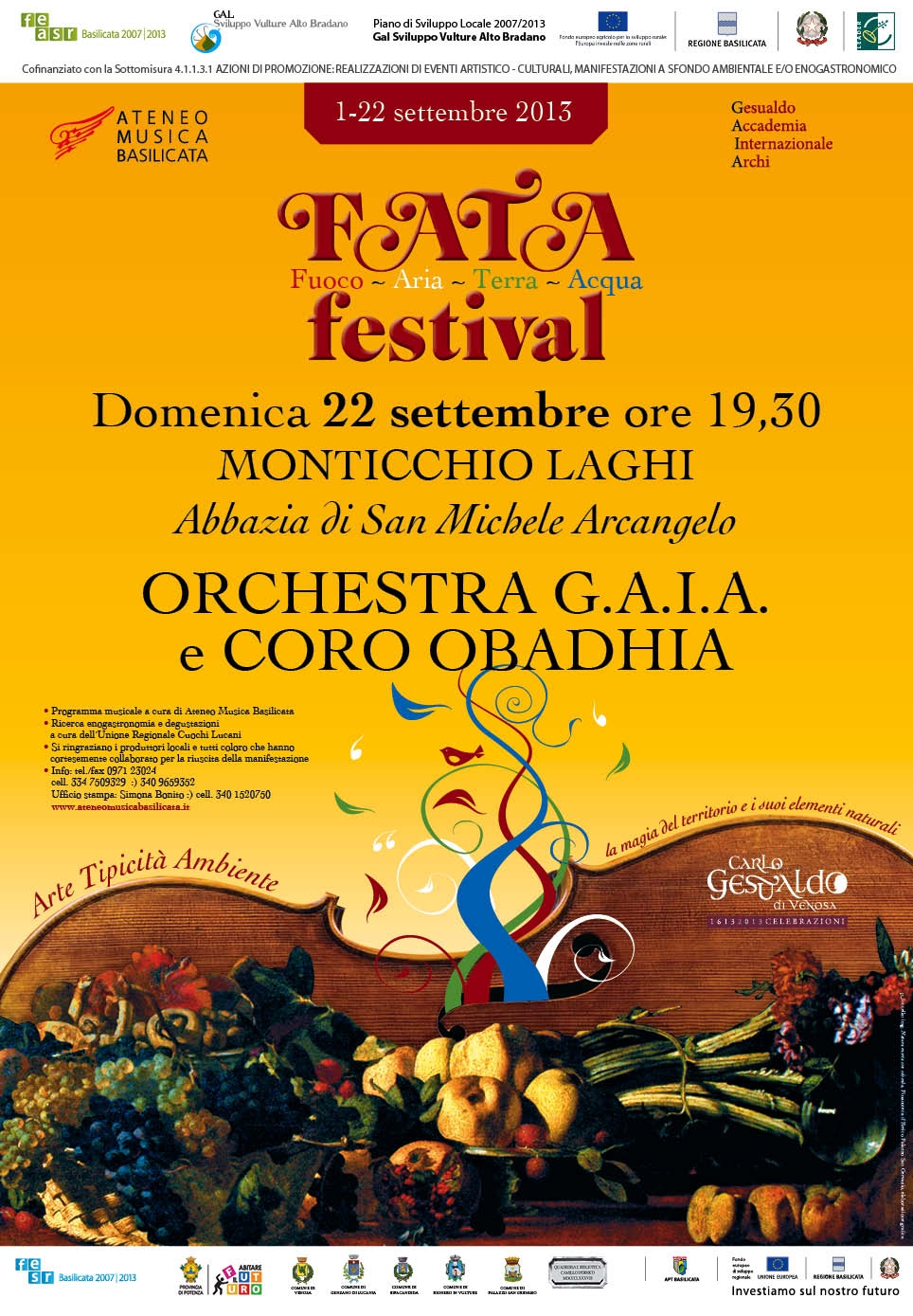 22 settembre, ore 19.30 – Abbazia di San Michele – Monticchio Laghi: concerto dei musicisti dell’Orchestra G.A.I.A diretta dal M° Giovanna D’Amato e del Coro Obadhia diretto dal M° Rocco Baccelliere.