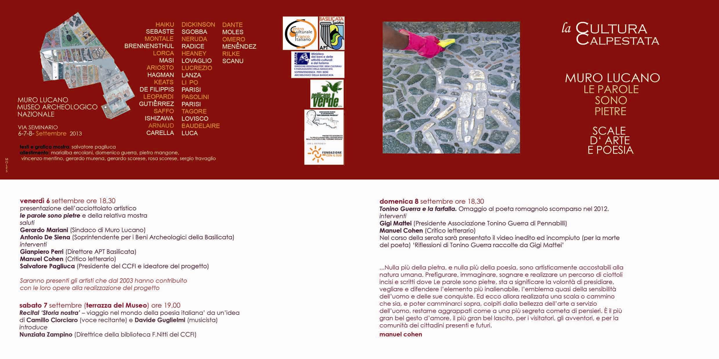 L’evento è organizzato dal Centro Culturale Franco-Italiano di Muro Lucano in collaborazione con la Soprintendenza per i Beni Archeologici della Basilicata e prevede la celebrazione dell’acciottolato artistico-poetico adiacente al Museo realizzato nel corso degli ultimi dieci anni.
