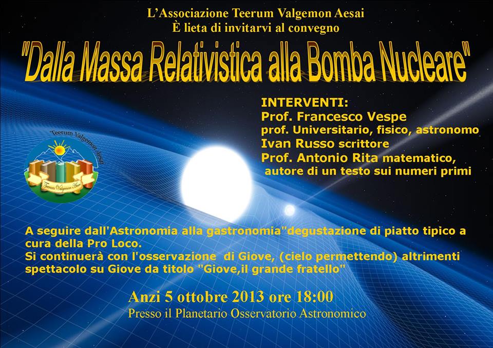 5 ottobre: “Dalla massa relativistica alla bomba nucleare” con l’avvocato Ivan russo e altri esperti.