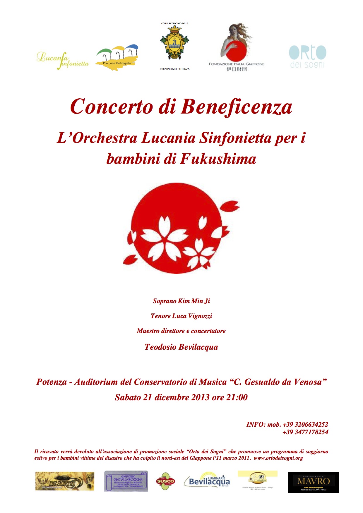Potenza – Si terrà a Potenza, il 21 dicembre alle ore 21:00 presso l’Auditorium del Conservatorio “Gesualdo Da Venosa”, la serata di beneficenza per supportare progetti a favore dei bambini colpiti dal disastro di Fukushima. Una serata all’insegna della solidarietà patrocinata dalla Provincia di Potenza e dalla Fondazione Italia Giappone e organizzata interamente dalla Associazione Lucania Sinfonietta, l’orchestra guidata dal giovane direttore e maestro concertatore Teodosio Bevilacqua.