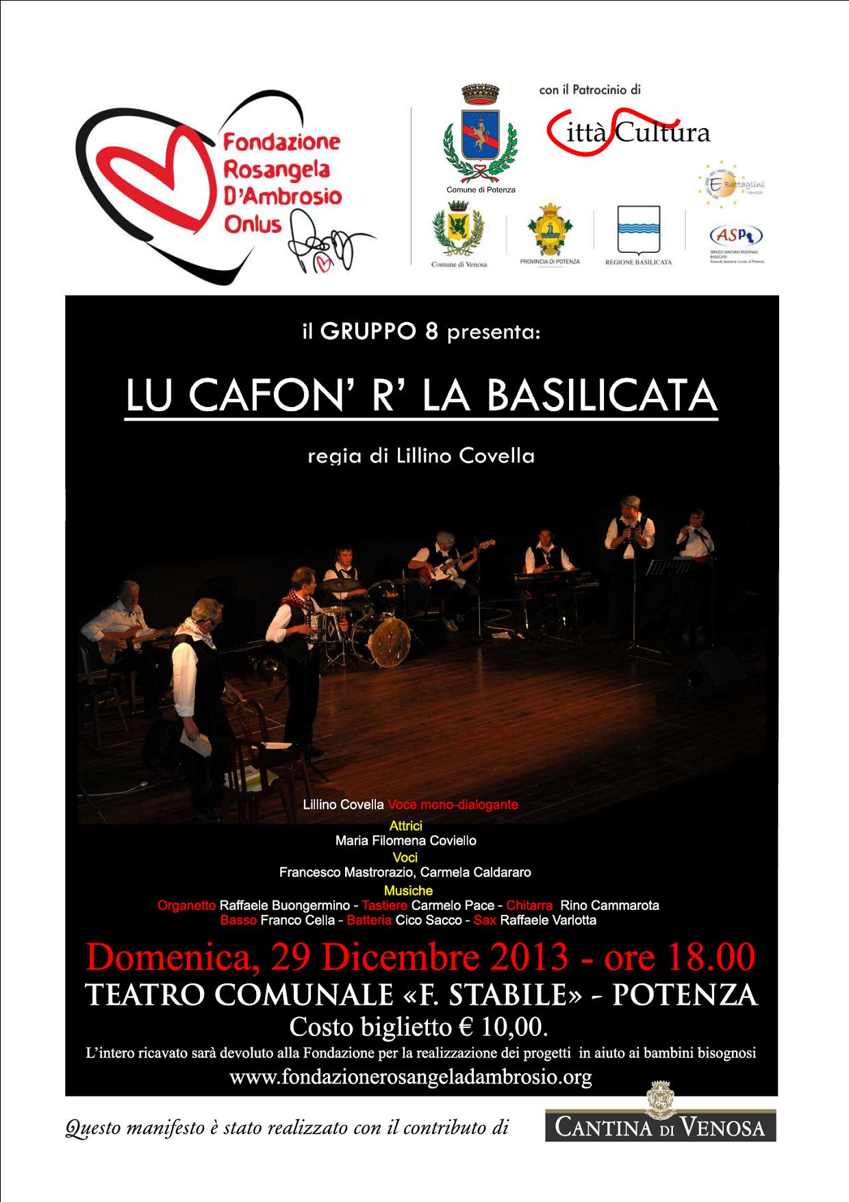 27 Dicembre 2013 Gruppo 8 “Lu cafon’ r’ la Basilicata”29 dicembre 2013, ore 18.00teatro F. Stabile, piazza m. Pagano – PotenzaL’intero ricavato sarà devoluto alla Fondazione Rosangela D’Ambrosio Onlus per la realizzazione dei progetti in aiuto ai bambini bisognosi. Cafon.jpg
