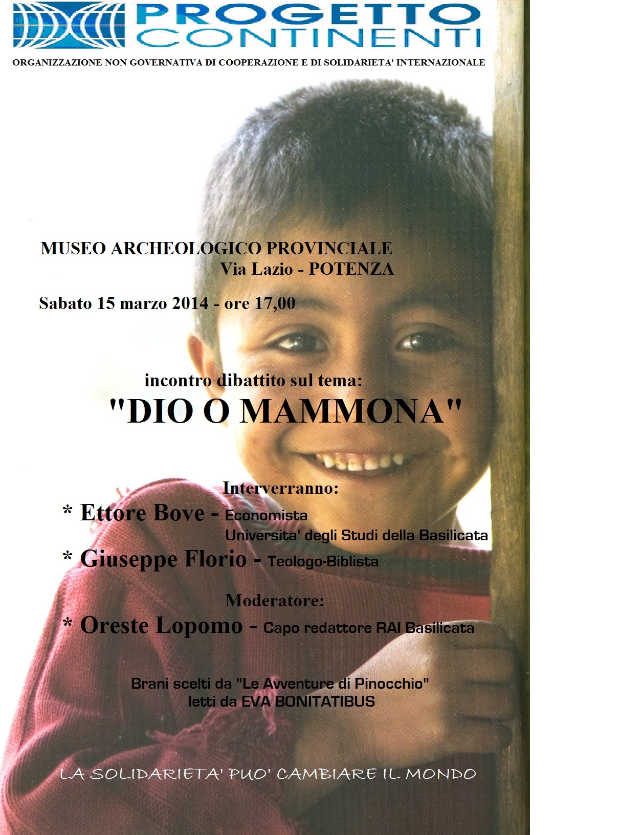 L’iniziativa è organizzata dal gruppo locale di PROGETTO CONTINENTI – onlus, associazione che, attraverso progetti specifici di solidarietà internazionali, opera nel Sud Est asiatico, in Corno d’Africa ed in America Latina, ed è patrocinata dalla provincia di Potenza.