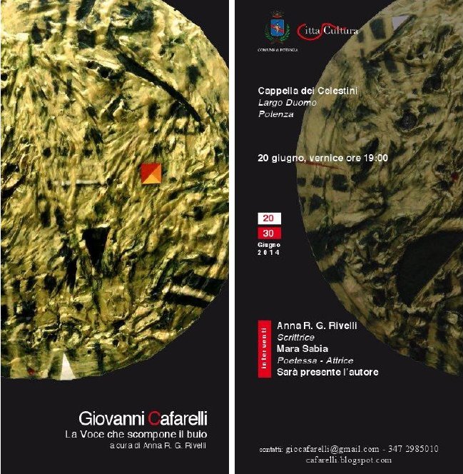 16 Giugno 2014 Giovanni Cafarelli La voce che scompone il buio Cappella dei Celestini, largo Duomo – Potenza Dal 20 al 30 giugno 2014 invito mostra CAFARELLI.jpg